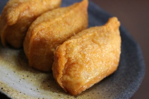 油揚げを甘くに煮て、中に寿司飯をつめたものであるが